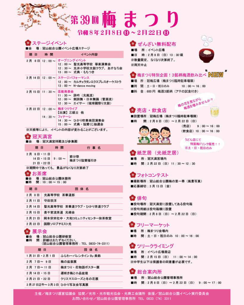 ※節分祭等の冠天満宮主催行事、冠山総合公園で開催される予定の個別の展示会等につきましては、冠山総合公園にお問合せ下さい。